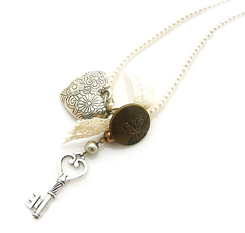 [Long style pearl necklace with palace retro carving,peach heart,key pendant] |